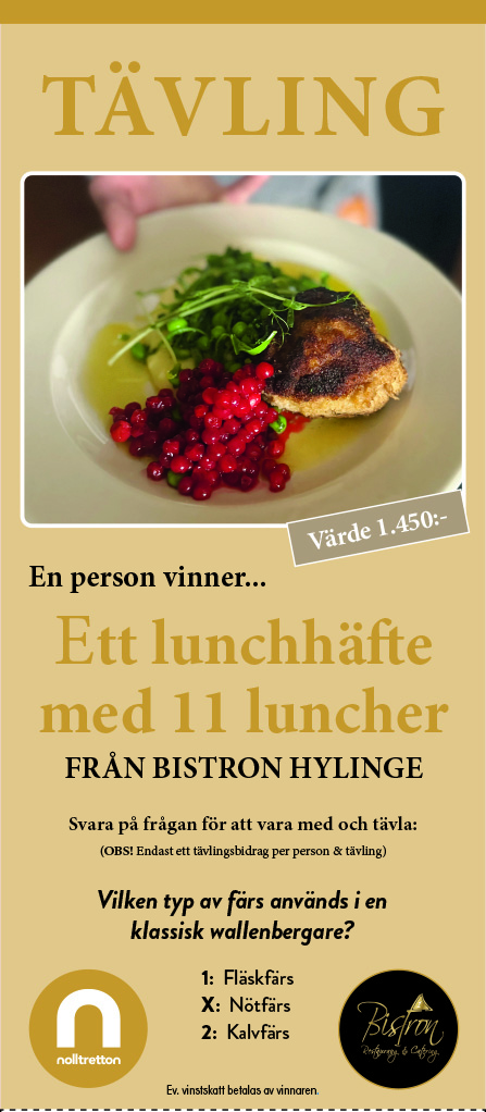 Tävla om ett lunchhäfte på Bistron Hylinge. - en person vinner ett häfte med 11 luncher (värde 1.450 kronor) (ev. vinstskatt betalas av vinnaren). Svara på frågan för att delta i tävlingen. Maila in svaret till benny@nolltretton.se senast den 20/3-2026. Märk ämnesraden med "Bistron Hylinge".
