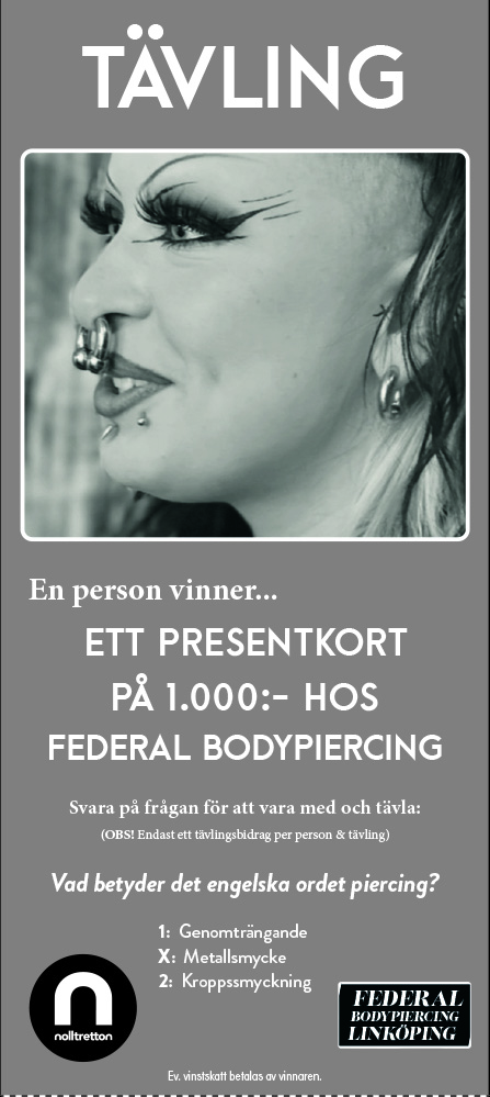 Tävla om ett presentkort på 1.000 kronor hos Federal Bodypiercing. (ev. vinstskatt betalas av vinnaren). Svara på frågan för att delta i tävlingen. Maila in svaret till benny@nolltretton.se senast den 6/5-2026. Märk ämnesraden med "Bodypiercing".