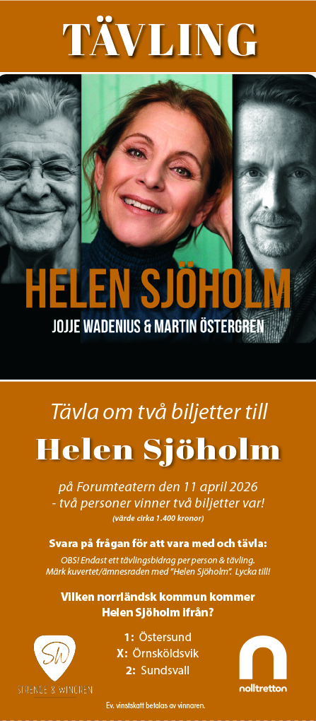 Tävla om två biljetter till konsert med Helen Sjöholm på Forumteatern den 11 april - två personer vinner två biljetter var! (värde 1.400:-) (ev. vinstskatt betalas av vinnaren). Svara på frågan för att delta i tävlingen. Maila in svaret till benny@nolltretton.se senast den 22/1-2026. Märk ämnesraden med "Helen Sjöholm".
